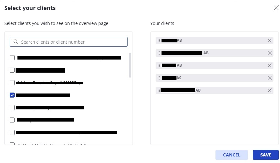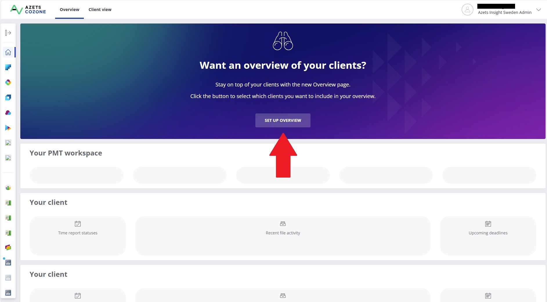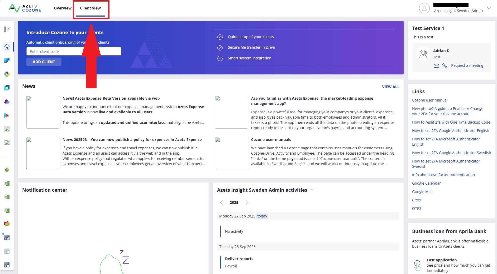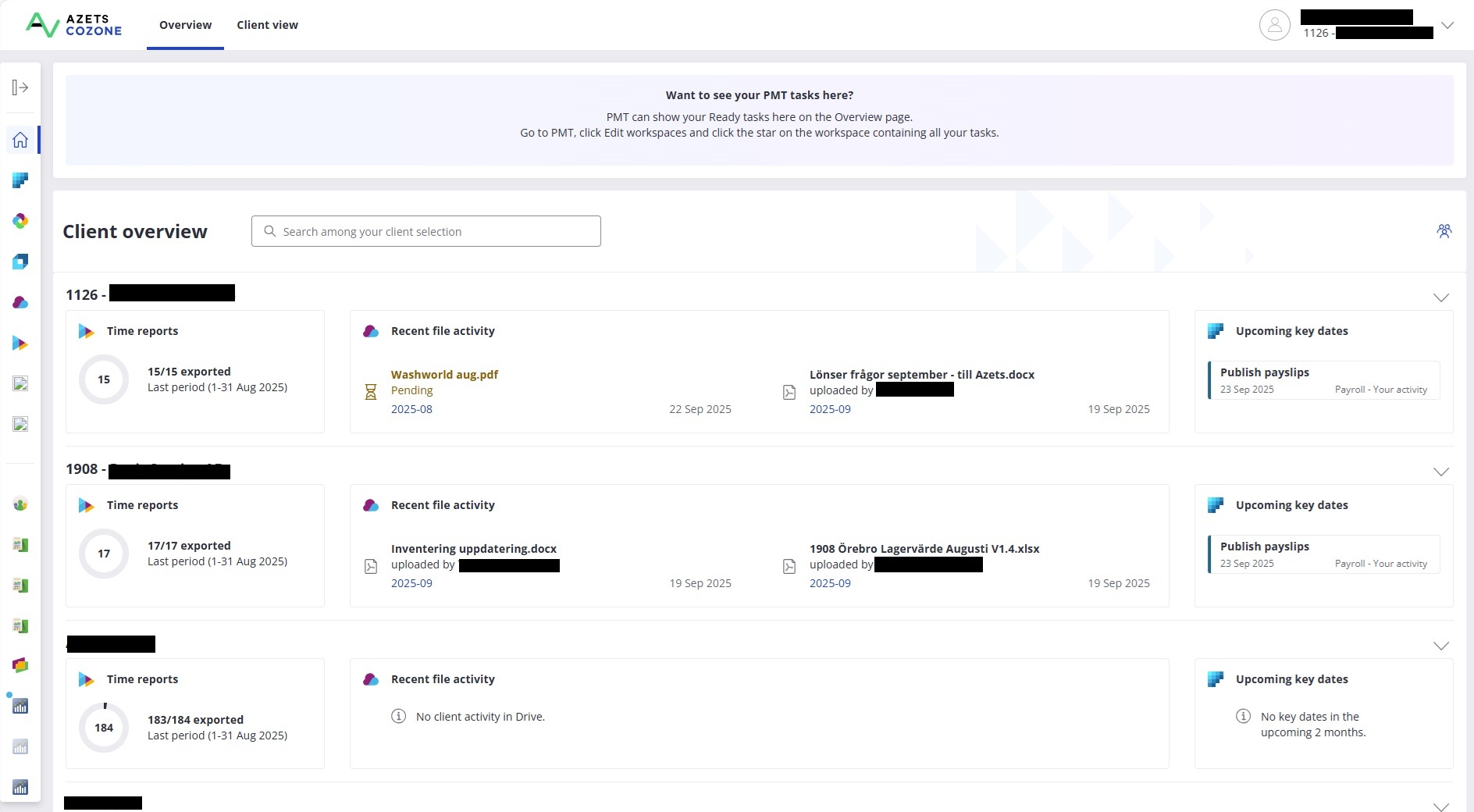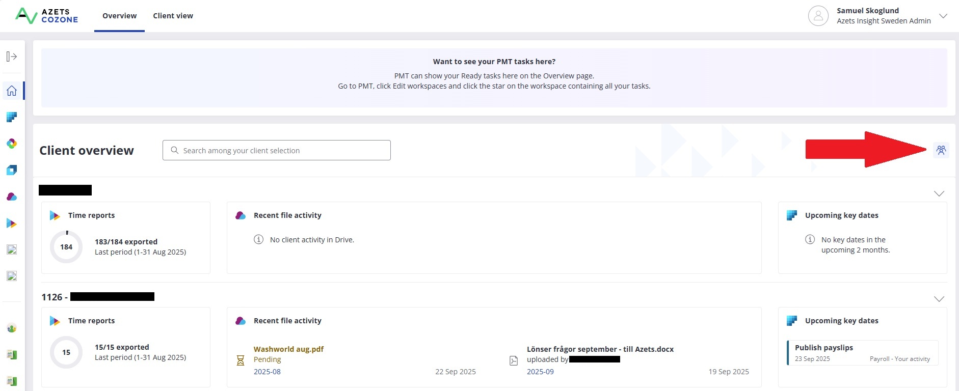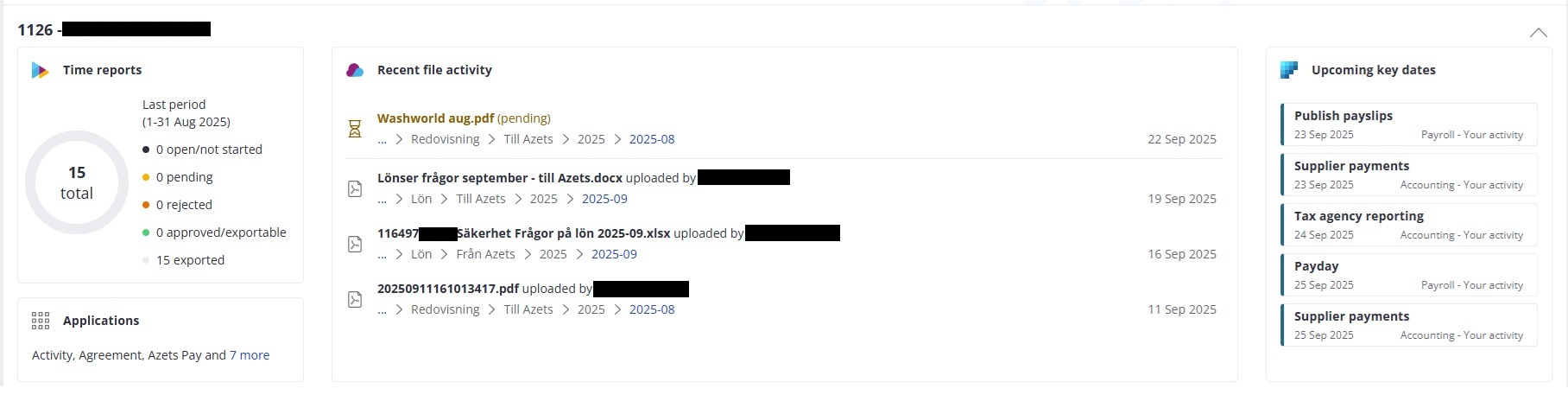 As a Azets colleague you will have your own view when logging into Cozone. This overview will be your new default landing page. Unlike our clients, whose focus is mainly on one or a handful of companies, Azets staff assist many clients with their needs. To provide a better overview for Azets staff on the landing page, we've created a easy-to-setup summary of what's going on with the different clients you're working with.